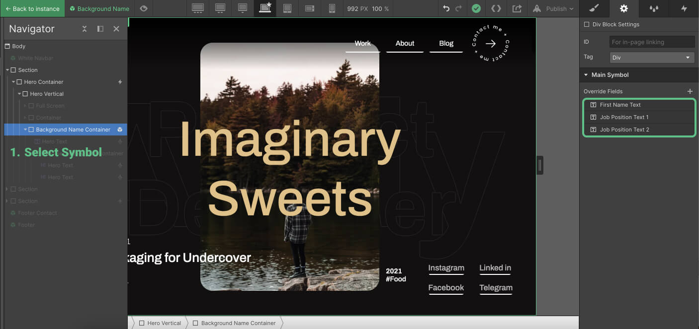Here's how you can change the Hero text, first select the symbol "Background Name Container" and on the right side bar you can see three texts, start with the first one being your name or whatever you want.