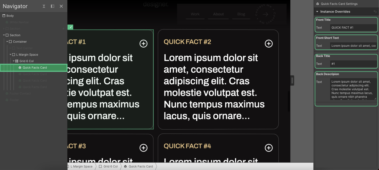 To Change the text on your cards, its pretty easy, Select the symbol "quick facts card" and on the right side bar you have 4 texts to change.